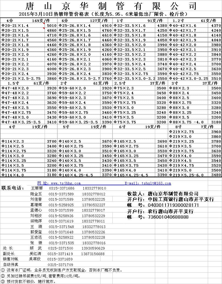 唐山京华2015年3月10日热镀锌管价格表(长度为5.95、6米最低出厂限价、检斤价) 浙、沪、贵、湘、鲁、赣