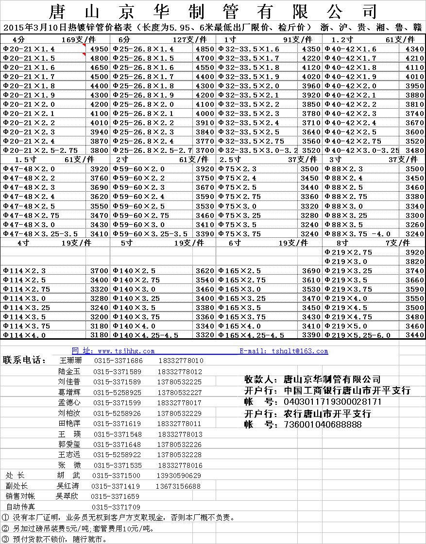 唐山京华2015年3月10日热镀锌管价格表(长度为5.95、6米最低出厂限价、检斤价) 浙、沪、贵、湘、鲁、赣