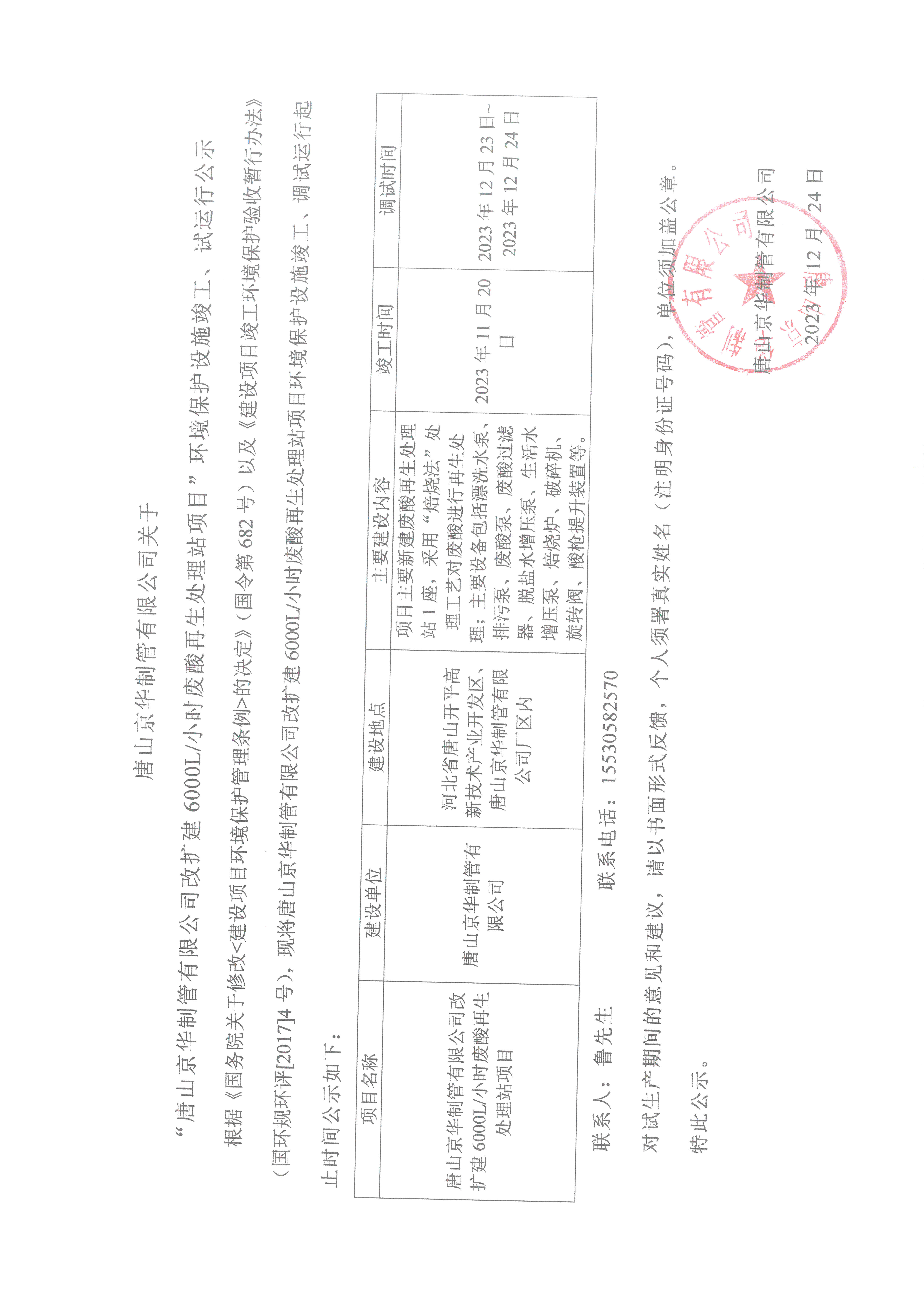 乐竞体育(中国)官方网站关于“乐竞体育(中国)官方网站改扩建6000L每小时废酸再生处理站项目”环境保护设施竣工、试运行公示