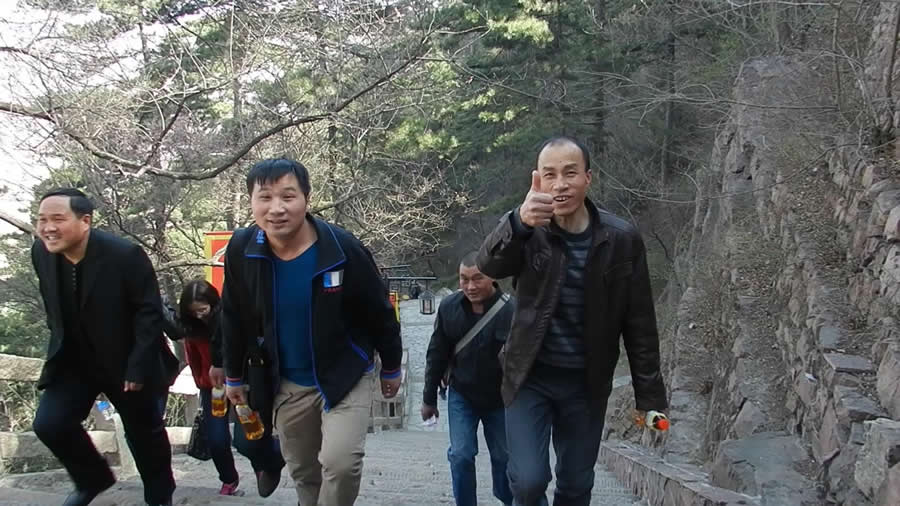 爬山活动开始了。一段依山栈道,令攀登者兴奋不已。一路上,梨花白、桃花艳,李花浓,一片盎然春景。拾阶而上,渐入山中。不见寺院,耳中却传来诵读经文的声音,寂静中给人带来一种空灵的感觉,使人顿觉远离城市喧嚣的淋漓。栈道的另一端是一段坡度很大的石阶,大家刚刚放松的心情又一次紧张起来。刚才还有说有笑,现在一个个都严肃起来,每个人都关注着自己的脚下,生怕有半点闪失。舒缓的石阶同样舒缓了人的心情,累了,可以坐在小亭里任清风吹去汗意,举目远眺,群山连绵起伏在薄雾中。忽然,上面传来浑洪的钟声,已经有人到了山顶。接近山顶,财神庙、狐仙洞、黄仙洞、知止洞让你目不暇接,“莫道君行早,还有早行人”的古训又使人加快了向上的步伐。大家一鼓作气爬到山顶,俯视脚下,山洼里的果树花开的正浓,一片白一片红,大家在享受优美自然景色的同时,也不忘留影纪念。